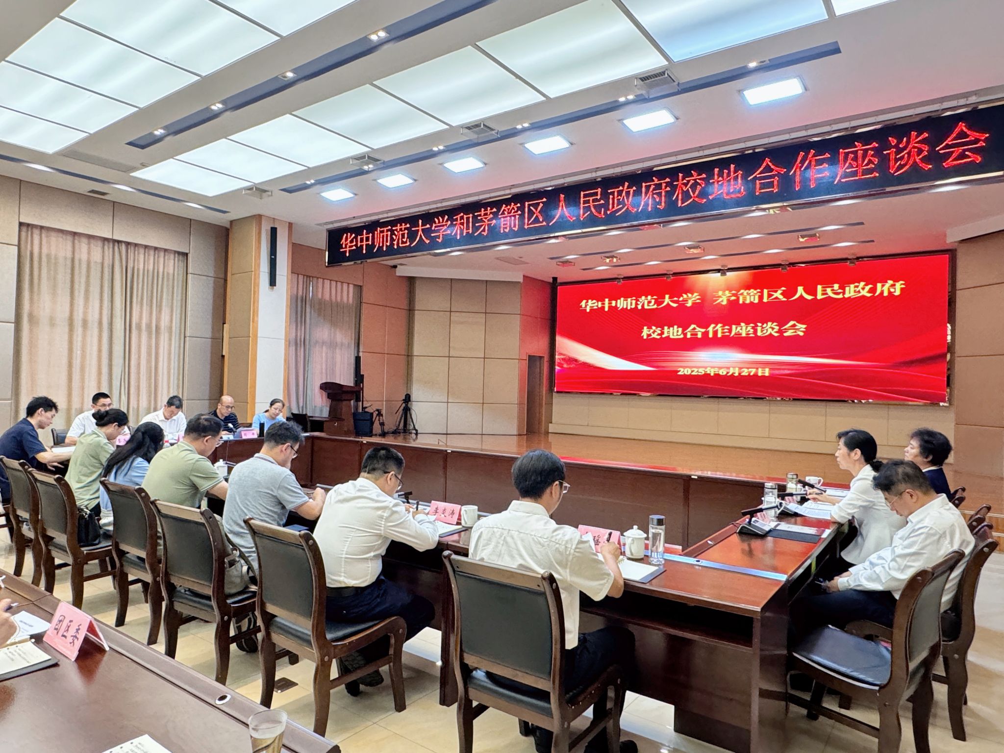 华大在线讯(通讯员 冯祖欣)6月27日,我校与十堰市茅箭区人民政府校地合作座谈会举行,签署校地合作协议,共同擘画人才共育、发展共谋的新篇章。副校长李鸿飞,十堰市茅箭区委书记李琴,区委副书记、区长何垚辰,区人大常委会主任金菊,区委常委、组织部部长李炎涛,副区长冉瑶函出席座谈会,以及我校社会学院党政班子和师生代表参加。